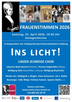 +43 680/2019054 oder info@maria-anna-mozart.at, www.maria-anna-mozart.at; online: www.mozarteum.at/konzerte?event=ins-licht&m=4-2026#info oder im Kartenbüro der Stiftung Mozarteum (Theatergasse 2); Abendkasse: € 18,-/erm. € 9.-, (Kinder ab 12, StudentInnen, Zivildiener), Vorverkauf: € 14,-/erm. € 7.-, Inhaber:innen der SN-Card u. Mitglieder des Ö1-Clubs: jeweils ermäßigt um € 2,-, Mitglieder der Maria-Anna-Mozart-Gesellschaft und des Vereins BarockPur: € 12.-.